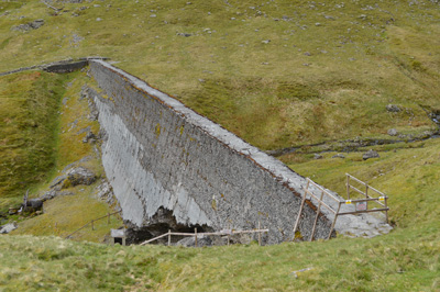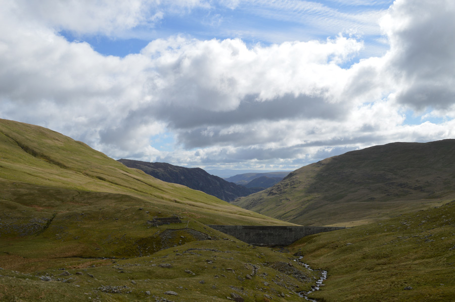 Here, looking back on Keppel Cove Dam with views towards Birkhouse Moor and Shefield Pike. |