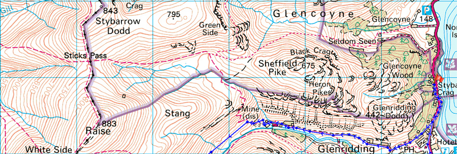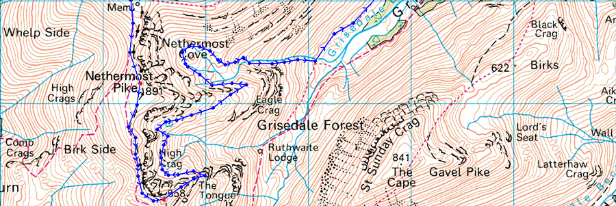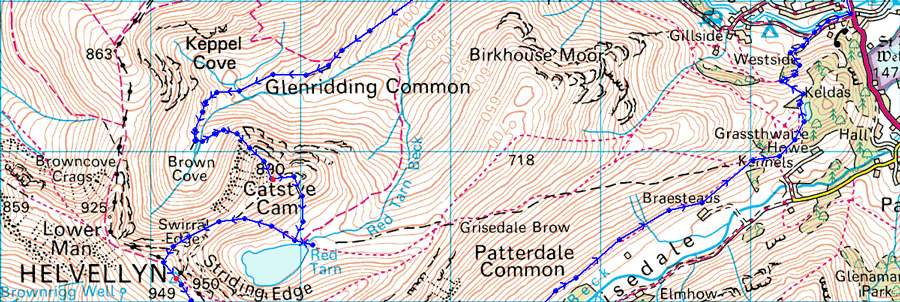 Glenridding - Greenside Road - Glenridding Beck - Brown Cove- Brown Cove Tarn - Catstye Cam north west ridge - Catstye Cam - Red Tarn - Swirral Edge - Helvellyn - Nethermost Pike - Dollywaggon Pike - The Tongue - Ruthwaite Cove - Hard Tarn - Nethermost Cove - Nethermost Beck - Grisedale - Lanty's Tarn - Glenridding |