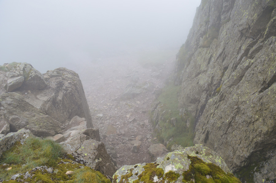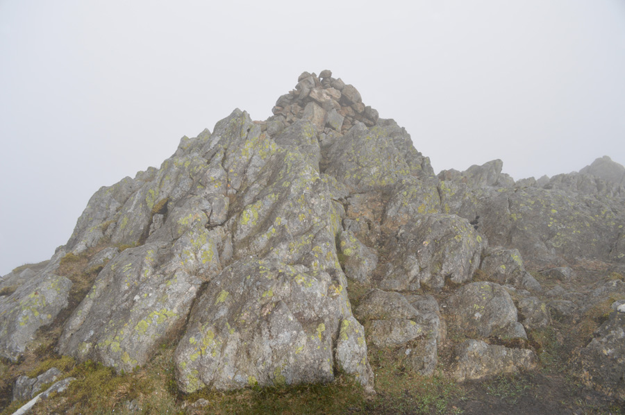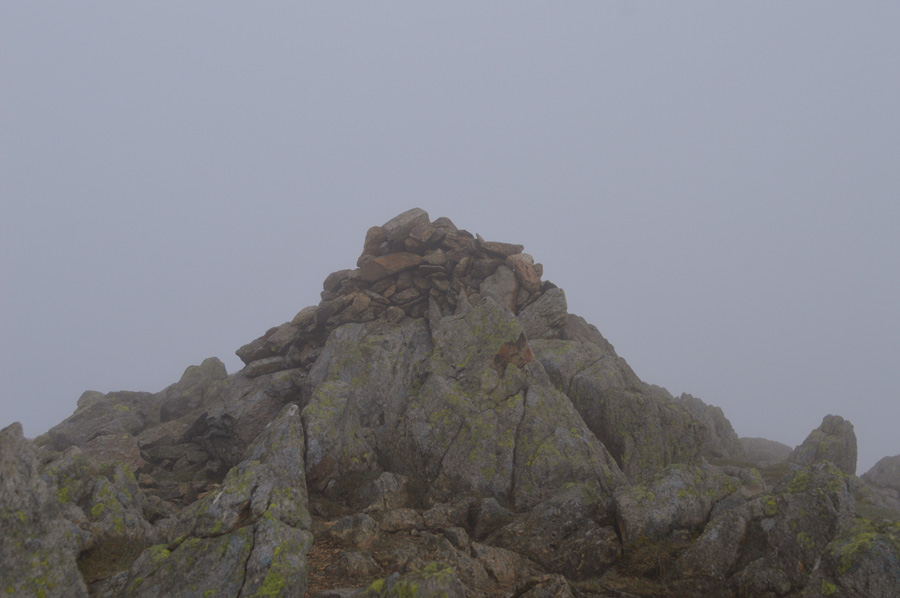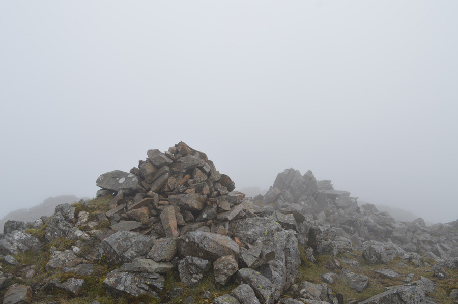 The summit of the first Crinkle is easily reached as you would expect, gaining my first summit was somewhat of an eerie experience as I pass over the top of Great Cove looking down its gullies made more menacing as they descend into a slow swirling mist. The path narrows and twist before the actual summit is reached, passing a marker cairn on-route which to could have easily been mistaken for the summit itself, despite having been here many times before, having a good eye for higher ground in these conditions can only be a good advantage, even it means those 'I'm sure it's a little bit further moments'