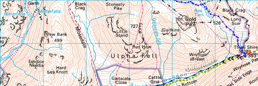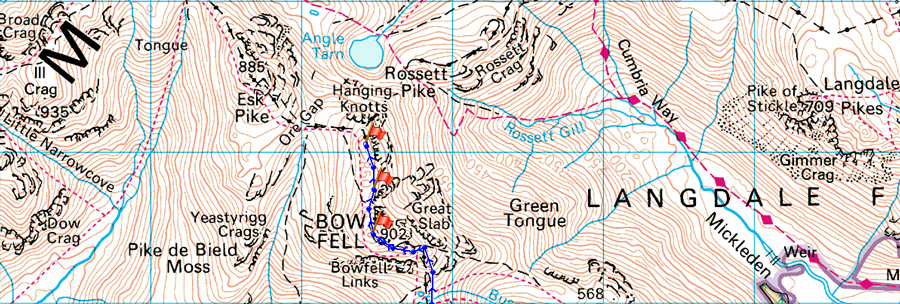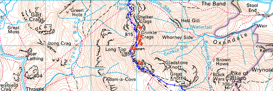 Three Shire Stone, Wrynose Pass - Red Tarn - Crinkle Crags - Shelter Crags - Three Tarns - Bowfell - Bowfell Buttress - Hanging Knotts - Bowfell - Crinkle Crags - Red Tarn - Three Shire Stone |