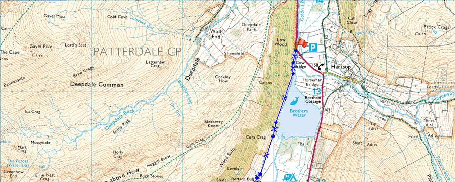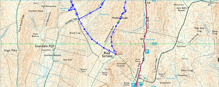 Cow Bridge - Brothers Water - Hartsop Hall - Caiston Glen - Top of Scandale Pass - Little Hart Crag - Scandale Tarn - Top of Scandale Pass - Red Screes - Smallthwaite Band - Middle Dodd - Hartsop Hall - Brothers Water - Cow Bridge |