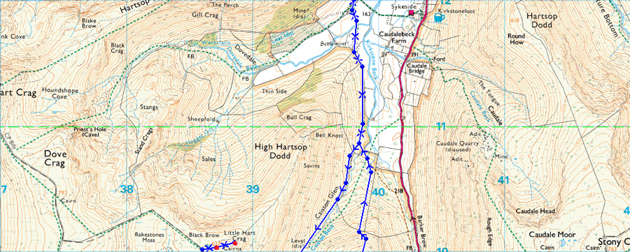 Once High Hartsop Dodd lower slopes have been flanked Caiston Beck soon comes into view, ahead a mile of pleasant walking with the sound of Caiston Beck for company for much of the way. Here a path can be found which leads you all the way towards the top of Scandale Pass, however should the lure of the many waterfalls found here guide you in, be sure to remember where you left the path. |