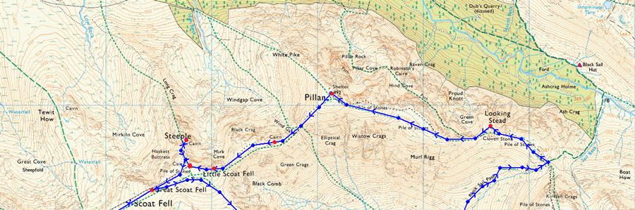 11, Looking Stead - Pillar - Black Crag - Little Scoat Fell - Scoat Fell (NY 158 114) - Steeple - Scoat Fell (Summit) - Little Gowder Crag - Red Pike (Wasdale) Stirrup Crag - Yewbarrow |