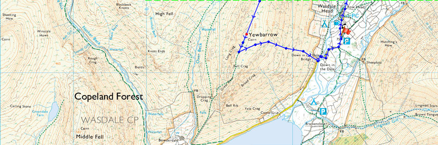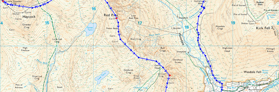 Wasdale Head - Mosedale - Black Sail Pass - Looking Stead - Pillar - Wind Gap - Black Crag - Scoat Fell - Steeple - Little Gowder Crag - Red Pike - Dore Head - Stirrup Crag - Yewbarrow - Bob Graham Relay Descent off Yewbarrow - Road Back to Wasdale Head |