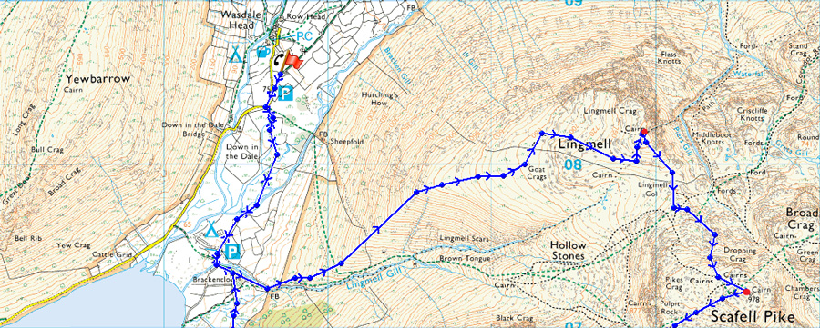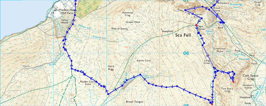 Wasdale Head - Down in the Dale - Brackenclose - Lingmell - Lingmell Col - Scafell Pike - Mickledore - Foxes Tarn gully - Mickledore - Lord's Rake - Scafell - Long Green - Slight Side - Long Gill - Hardrigg Gill - Hard Rigg - Corpse Road - Brackenclose - Down in the Dale - Wasdale Head |