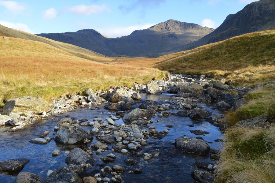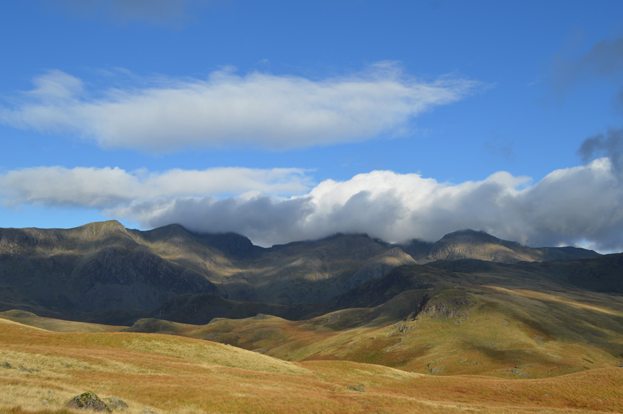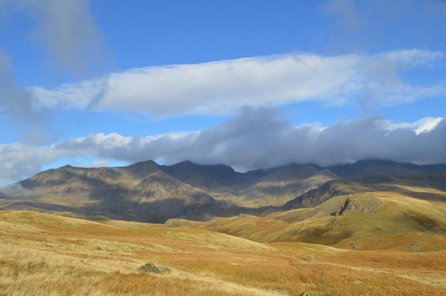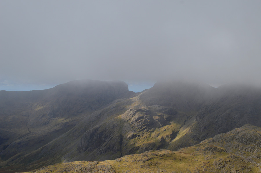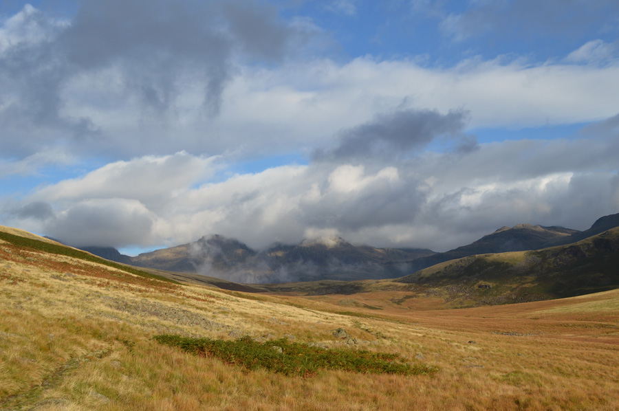 The Scafells and III Crag under cloud seen before I cross Lingcove Beck. |