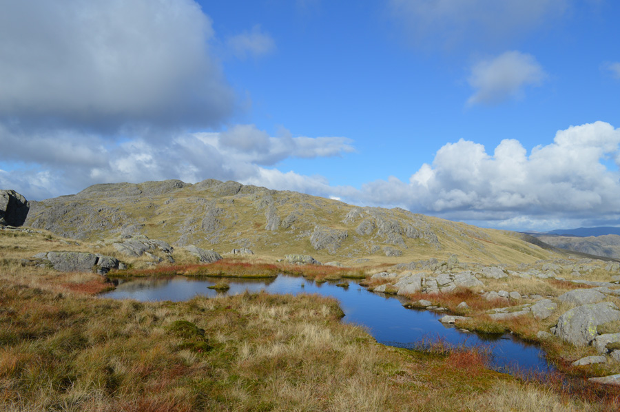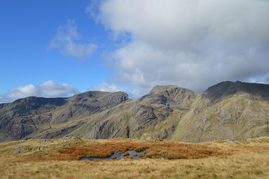 Here, looking back on Stonesty Pike and Crinkle Crags from a pool found below Little Stand summit. |