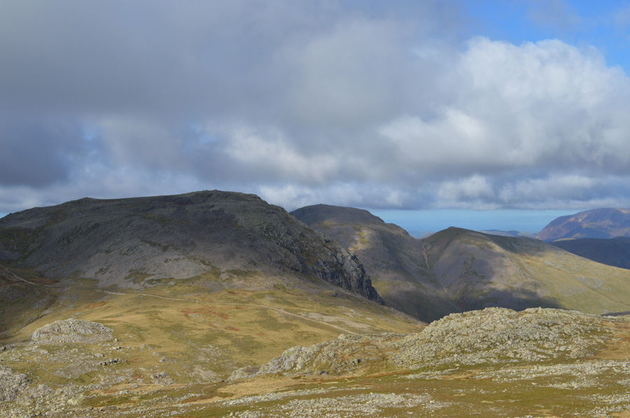 Views over Esk Hause towards Great End, Great Gable and Green Gable from Esk Pike. |