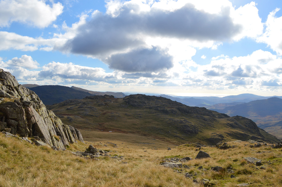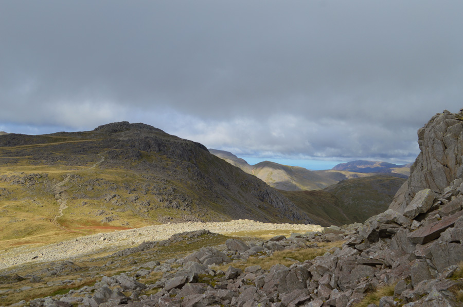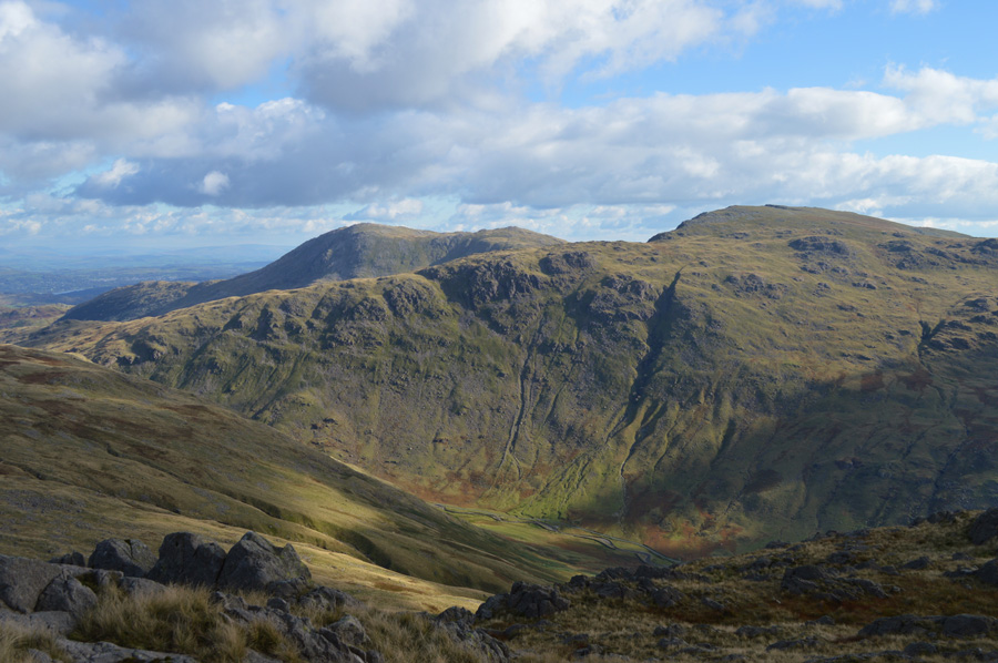 Views towards Hanging Knotts and Bowfell over Ore Gap. |