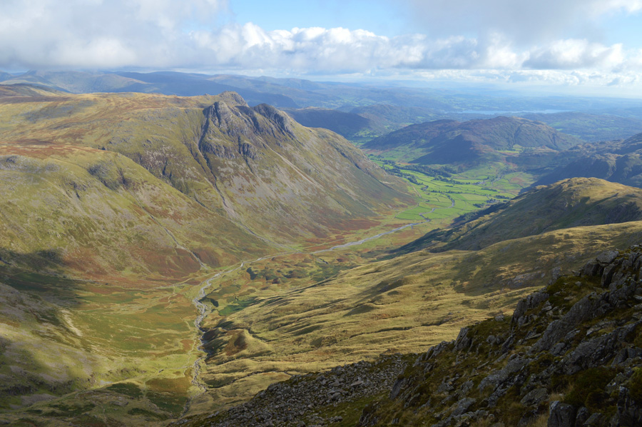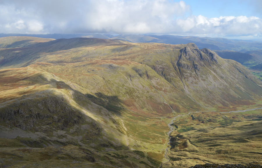 The Langstrath Valley shouldered by the Glaramara Ridge on the left and Rossett Pike on the right. |