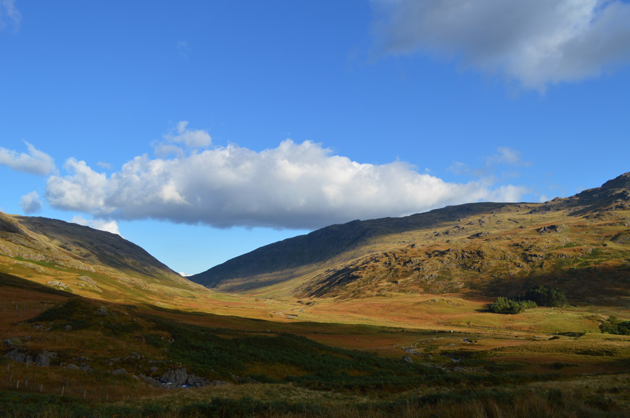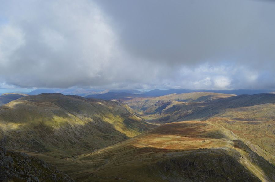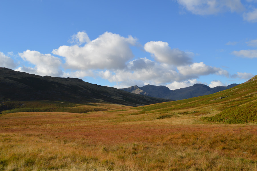 The head of Mosedale in now offering mouth watering views of the Scafells and I am struggling to put my camera down, ahead a sea of wild grasses in their Autumnal turn with lengthening dark shadows created by Lakeland giants, it's fair to say that I stayed fixed on this spot for a while if not only to study my route, but to also take it all in. |