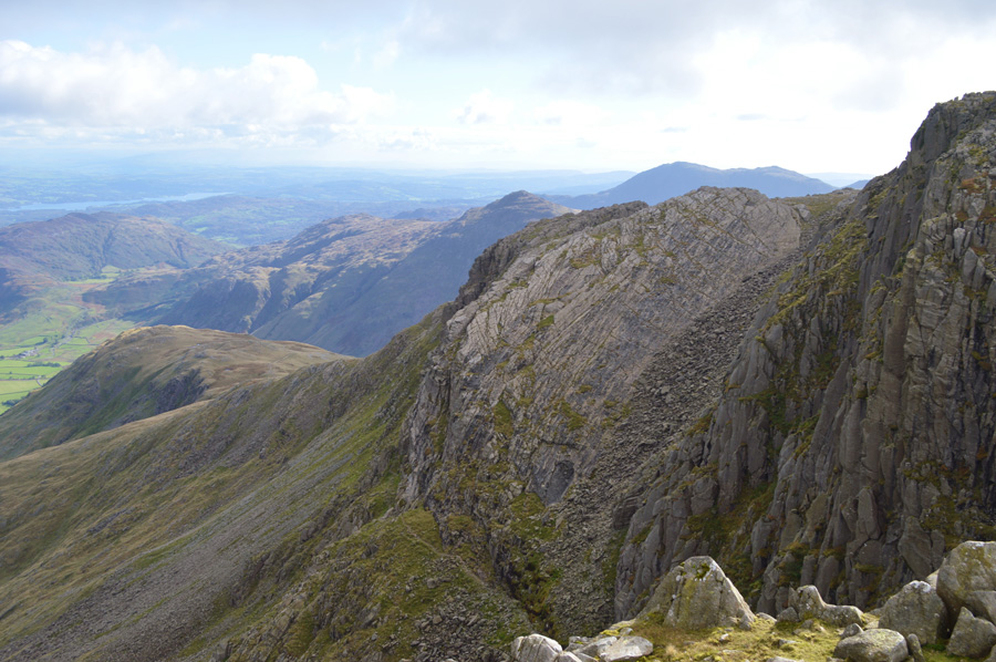 A fine view over Yeastyrigg Crags and Pike de Bield towards the Scafells from the summit of Bowfell. |