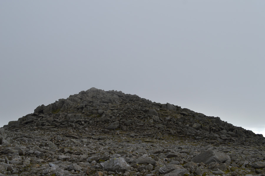 Esk Pike summit with a distant, and murky view of the Scafells. |