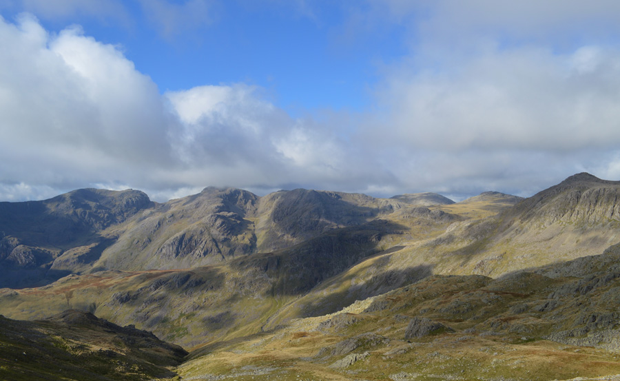 III Crag, Esk Pike and the Yeastyrigg Crags Ridge seen with Bowfell over on the right. |