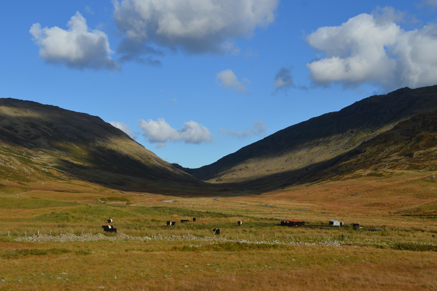 After a rather arduous descent from Little Stand I was able to gather myself with outstanding views back towards the Scafells through the beautiful valley of Mosedale whose grasses were set alight in their Autumnal glory, by now the sun was still high but I could see that it was sinking much faster than that of late, within two hours the temperatures will have dropped and mother nature will say good night to the fells for another day, me I've still got to tramp through all those cow pats again thanks to those guys bringing my walking day to an end.