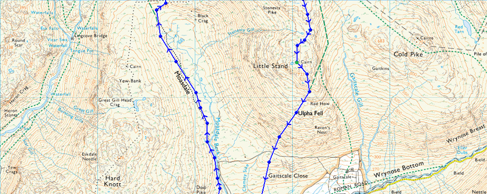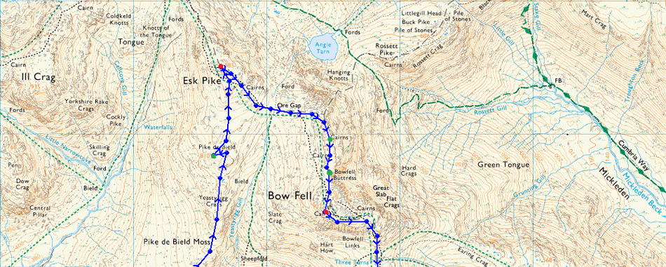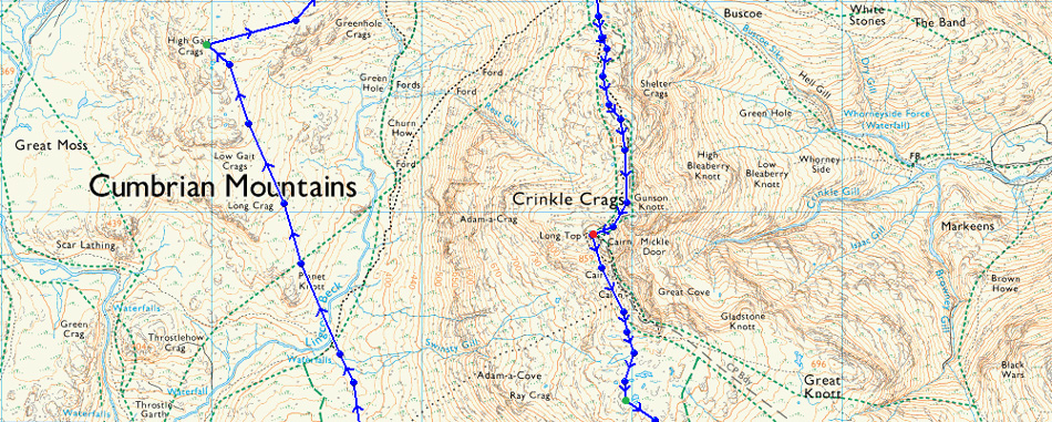 Cockley Beck Bridge - Mosedale - Lingcove Beck - High Gait Crags - Yeastyrigg Crags - Pike de Bield - Esk Pike - Ore Gap - Hanging Knotts - Bowfell Buttress - Bowfell - Three Tarns - Crinkle Crags - Stonesty Pike - Little Stand - Cockley Beck Bridge |