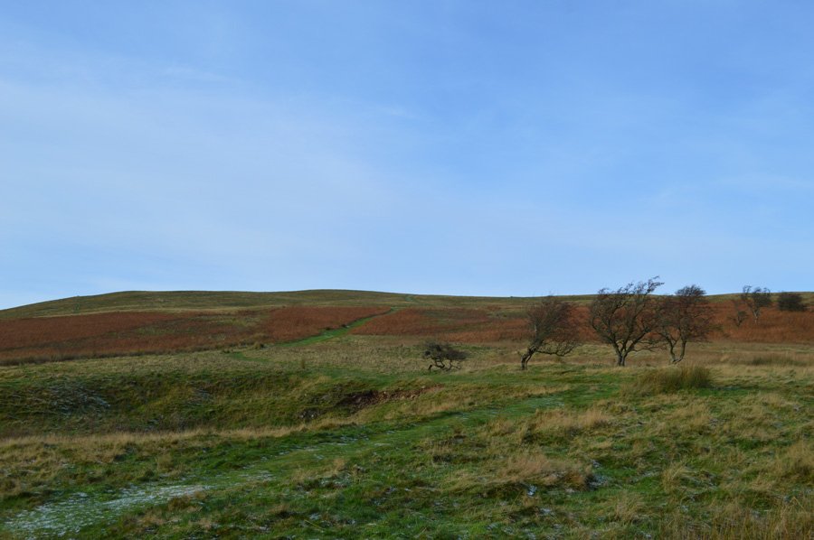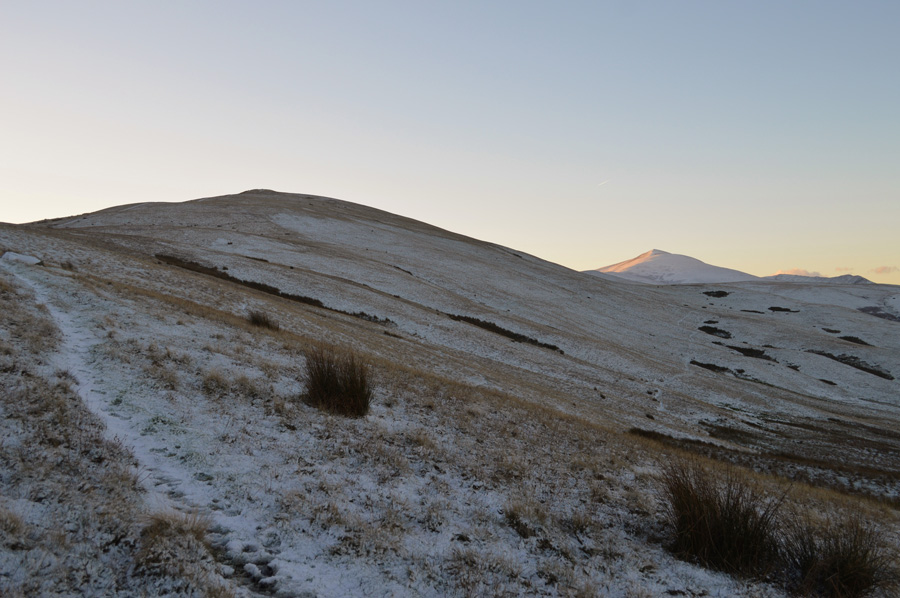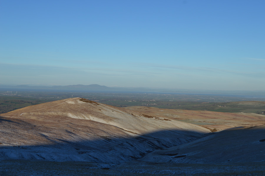 it was during the time when we joined the lower ridge path did we start to feel the effects of the chill made more apparent to the skin by a westerly wind as we started to gain in height. Our route ahead was largely in shadow due to the slow rising sun at this time of year, although every now and again a show of light would appear with the more height we earned. |