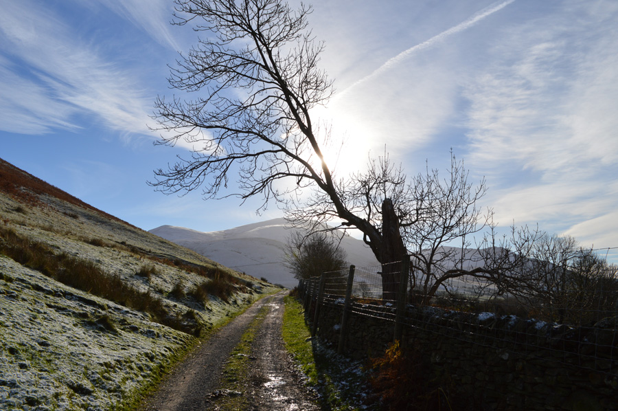 All that was left was for us to kit up which was done quite quickly, the thought of kitting up with no rain forecast boded well even though it wasn't spoken of, for the first time in a month I am able to shoulder my camera instead of having to keep it in its bulky weatherproof case. Only a quarter of an hour has passed since leaving Binsey Cottage but the light was changing every minute despite the sun still being low it's now starting to feel like dawn something of which I have only ever experienced whilst being sat behind a desk as of late, it just seemed to feel so good to be outdoors this morning during the cusp of the winter months. We strode out onto the Cumbrian way over a thin layer of powdery snow, underfoot the ground is frozen, so much so our walking pole tips do not penetrate which just goes to show how rapid the temperatures have dropped causing the recent sodden ground to freeze over recent nights.