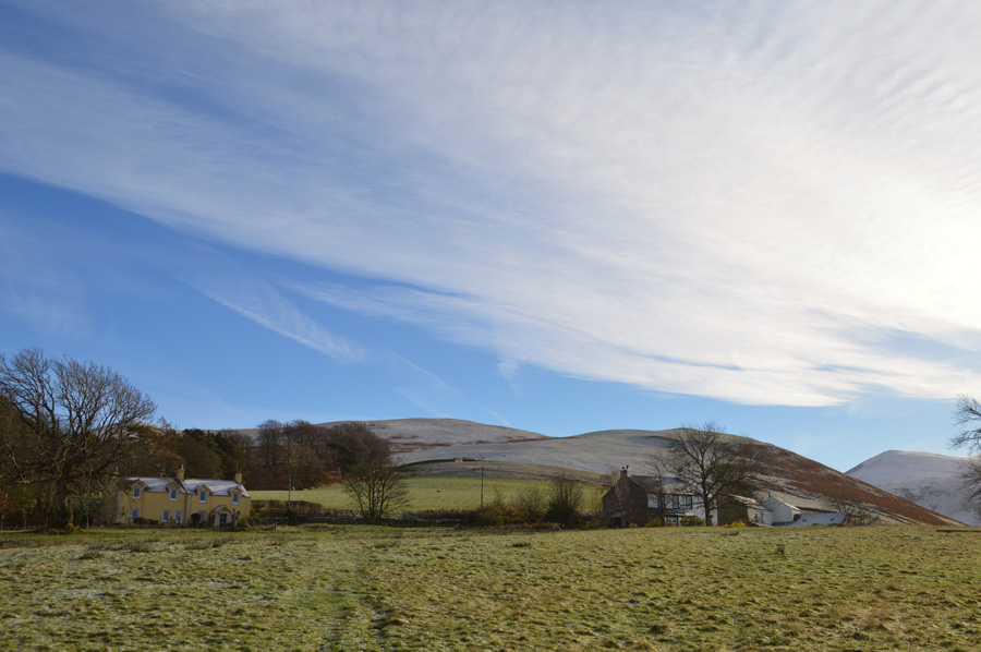 We follow a solo set of boot, and paw prints in the snow over the sound of dogs barking as we pass one particular exclusive cottage that has the backdrop of the Uldale Fells in its back garden. Our path rises steadily towards the foot of Longlands Fell north ridge as we head towards a shortcut which cuts through a patch of bracken, today made more visible, outlined by the recent snowfall. |