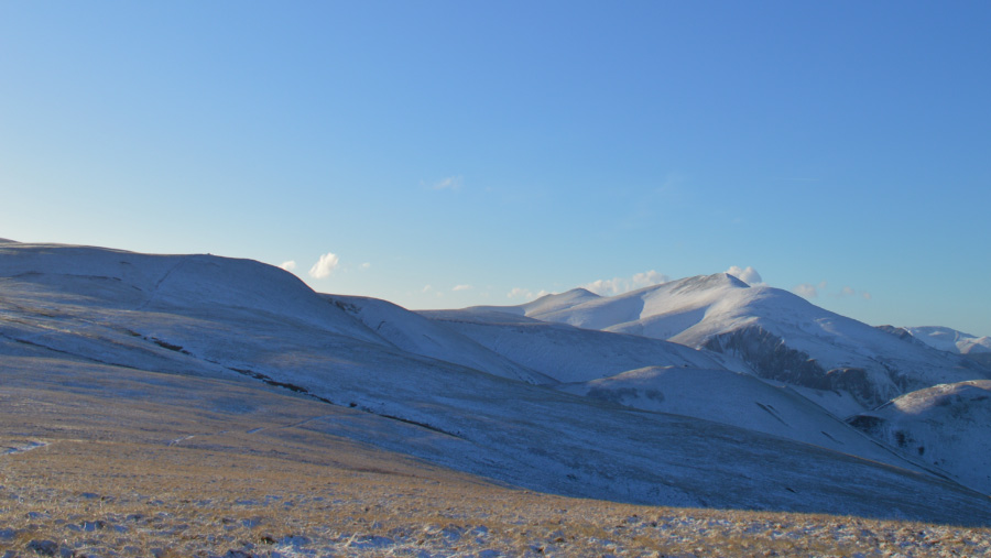 We now head south before a slight ascent which will gain hand on Little Sca Fell and thereafter Great Sca Fell seen in the left of the photo, from the summit we will descend west towards Meal Fell before crossing Trusmador and gaining Great Cockup seen in the lower right of the photo, but all of that is yet to come, lets for now enjoy the first snow of winter on some much loved fells. |