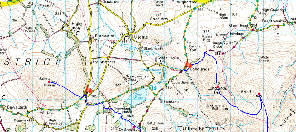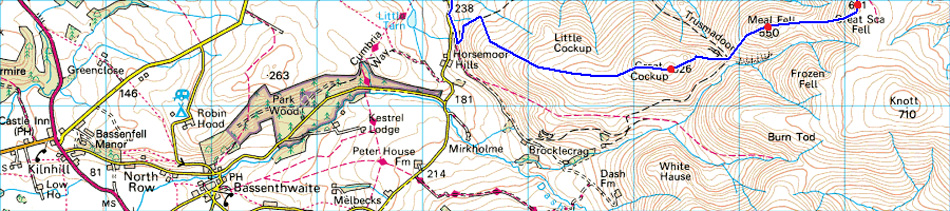 Longlands - Longlands Fell - Top of Charleton Gill - Brae Fell - Little Sca Fell - Great Sca Fell - Meal Fell - Trusmadoor - Great Cockup - Orthwaite Bank - Orthwaite - Overwater Hall - Binsey |