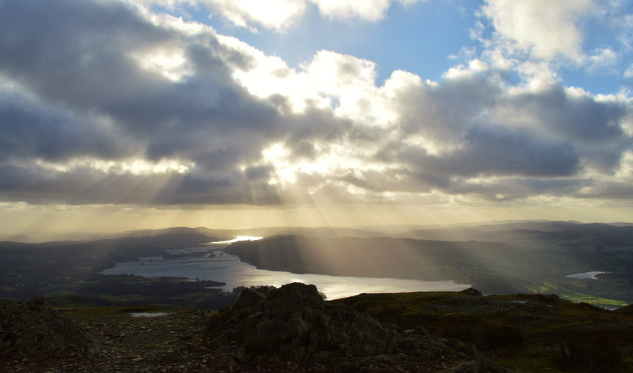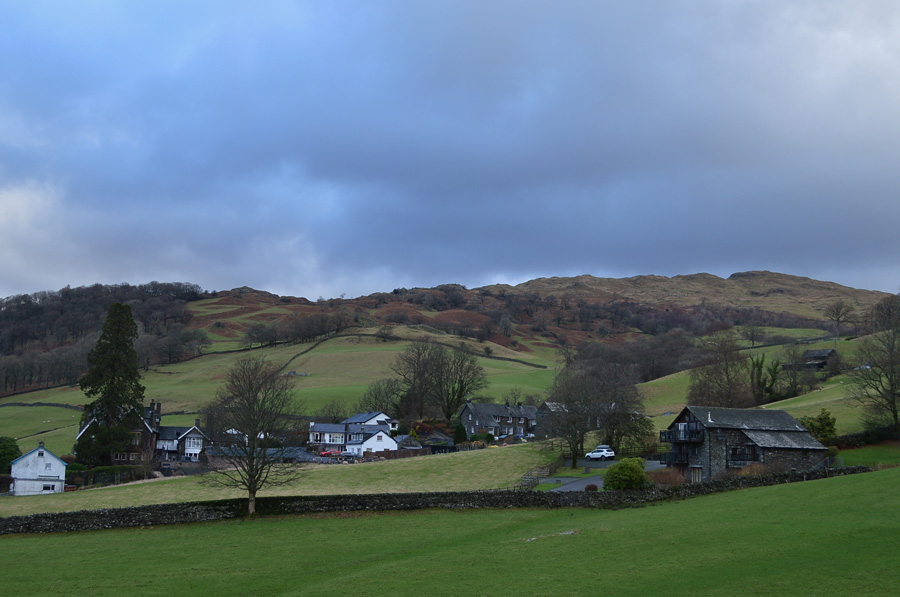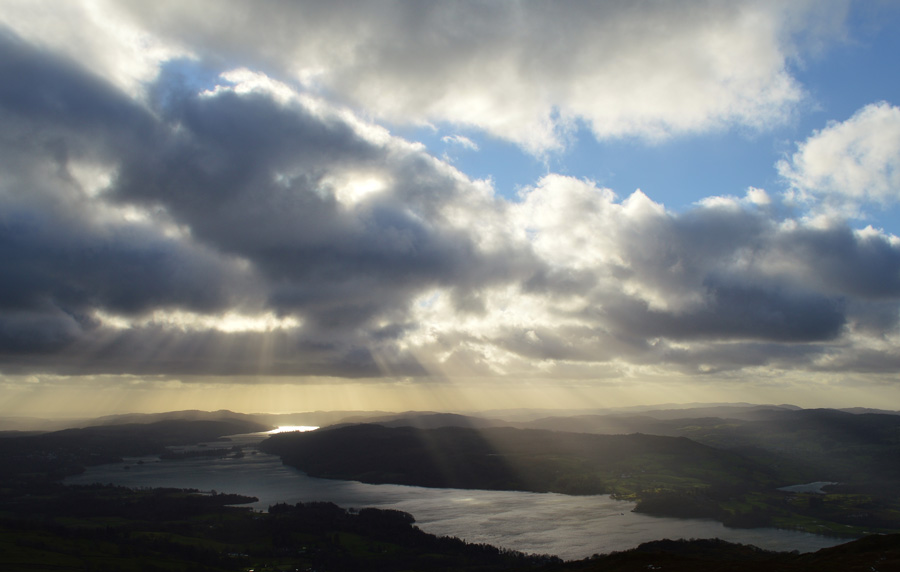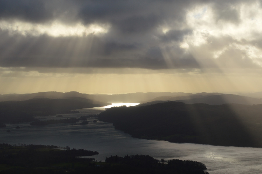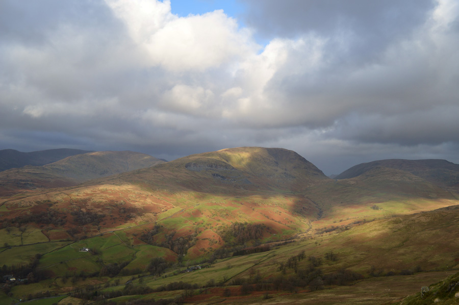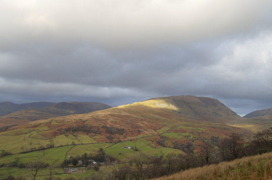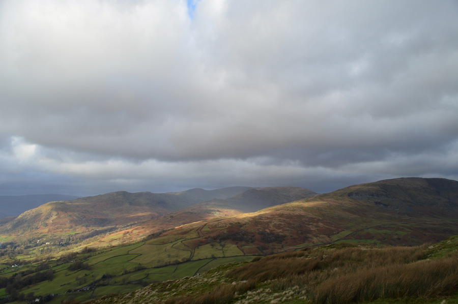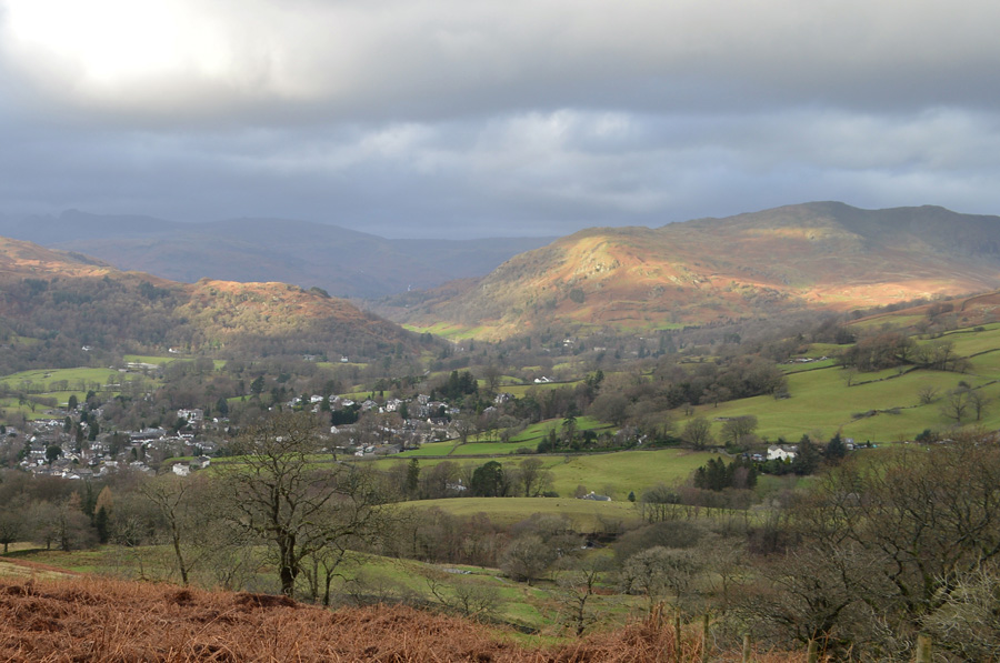 Highlights of sunshine over Ambleside, Lanty Scar and Nab Scar. |