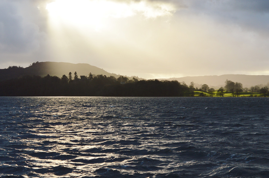 Everynow and again the sun would appear from behind the clouds leaving a streak of light across the waters surface. |