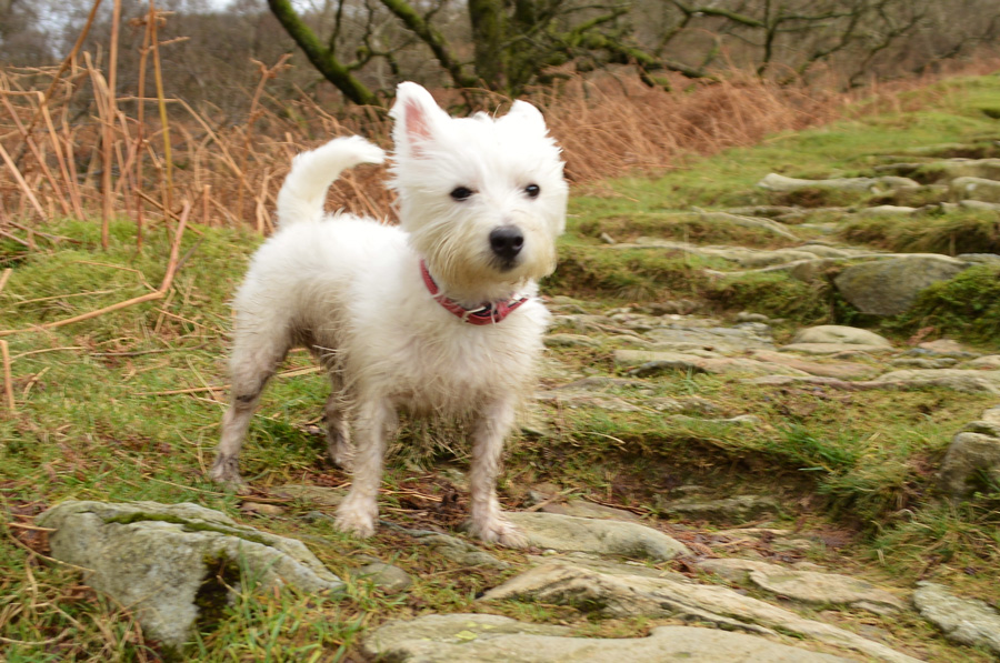 Holly had dropped behind and a one point she was out of sight until I called her name before she came running around the bend almost tripping through a puddle at full speed, her face is covered in mud and she looks like shes been up to mischief! |