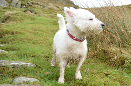 The ground was completely sodden underfoot as I arrive at the stone wall having just descending from the summit, I hadn't given my route any thought having just gone through a hail shower which lasted around five minutes, I couldn't help spare a thought for poor Hollys head as we took shelter behind the wall.