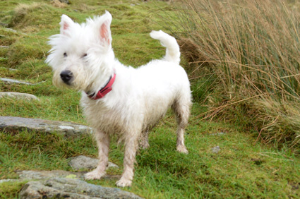 There is a fine rocky staircase that leads you most of the way towards the summit, which in places can be steep at times. Holly now has come to the conclusion that if she waits under the little rock steps 'dad will help me up' which of course I do, then she trots off on her merry way... |