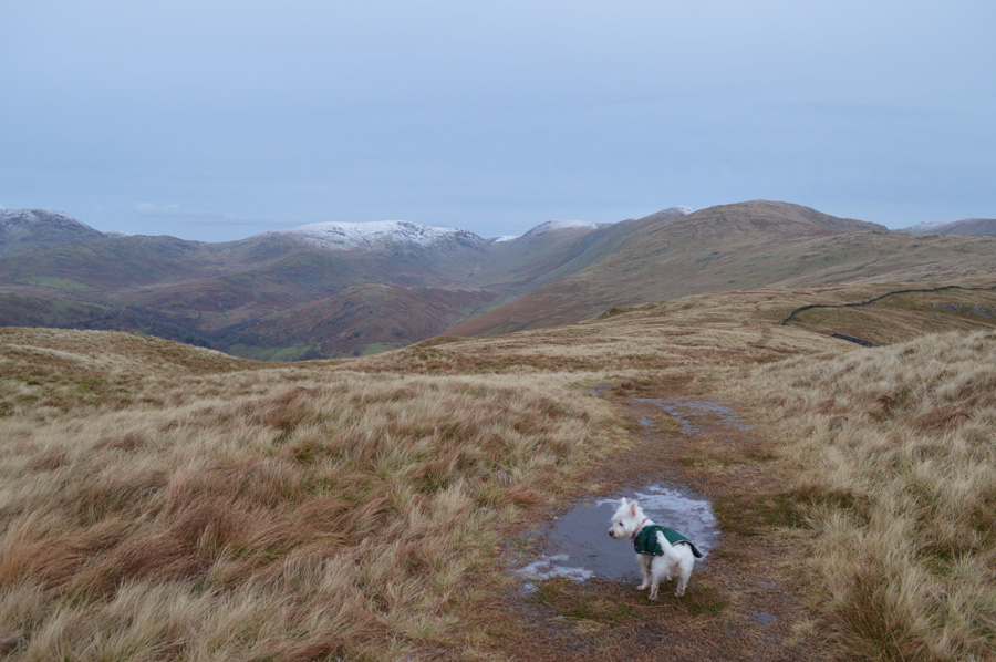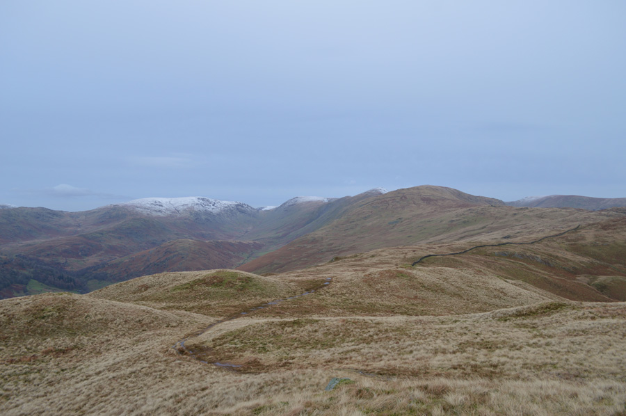 Crossing Moor Head with views of The Tongue, Caudale Moor, Thornthwaite Crag and the III Bell Ridge. |