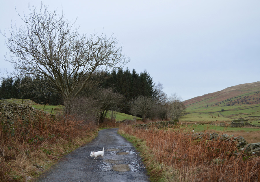 Despite the walk getting under way things weren't really warming up as fingers and ears started to freeze up, its a little to early to add a hat and gloves and feel the benefit so I put up with it a while longer all the while making star fist with both hands. A large 4x4 is heading towards us as I call Holly in to stand at the side of me whilst it passes breaking through the ice puddles as it does, I get a wave from the driver who is a woman and by the looks of things the whole family are out too. |