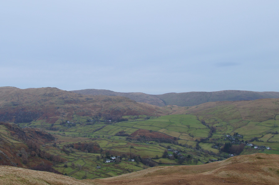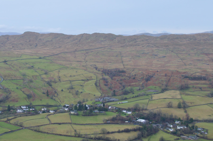 Views over the Troutbeck rooftops towards Wansfell Pike. |