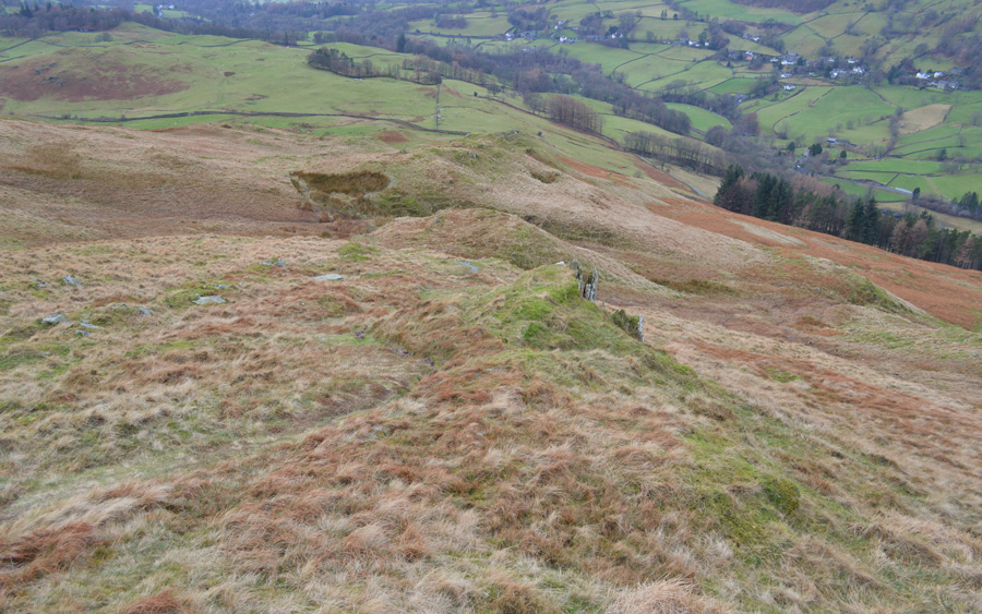 Grouse Butts line the path after leaving Sallows summit with views over Scour Rigg and Kentmere. |