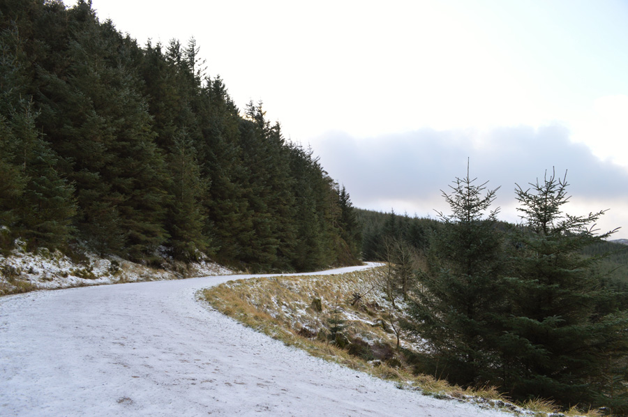 After passing through the woods we opened out onto this forestry track which incidently, is the same track we had left to climb Brown How earlier. We descend slightly towards the bend in the road before picking up the path you see that heads off into the trees. |