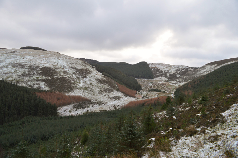 Broom Fell is descended towards Widow Hause under sunnier skies despite the temperature still well below zero we were both thankful of the protection that the plantation ahead would provide. With Broom Fell behind us we cross Widow Hause passing a large number of sheep no doubt seeking the same protection from the wind as we are.