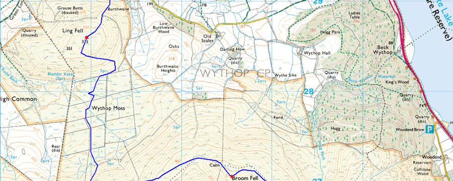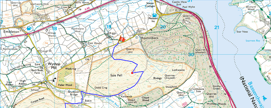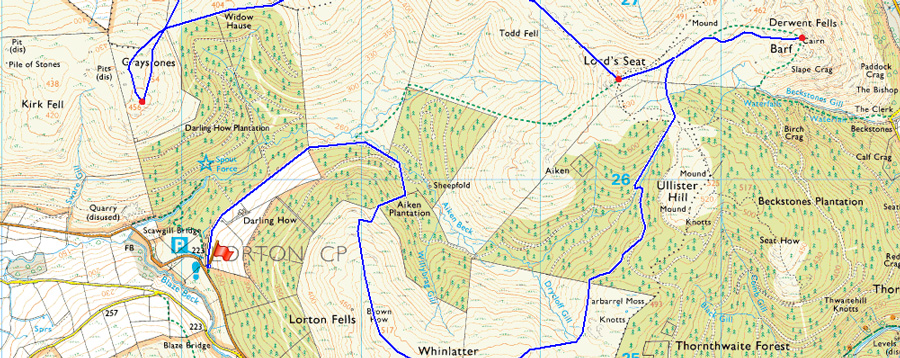 Darling How - Aiken Plantation - Brown How - Whinlatter - Tarbarrel Moss - Barf - Lord's Seat - Broom Fell - Widow Hause - Graystones - Wythop Moss - Brumston Bridge - Ling Fell - Kelswick Farm - Sale Fell - Wythop Church |