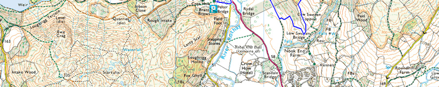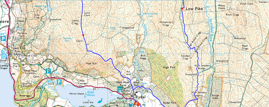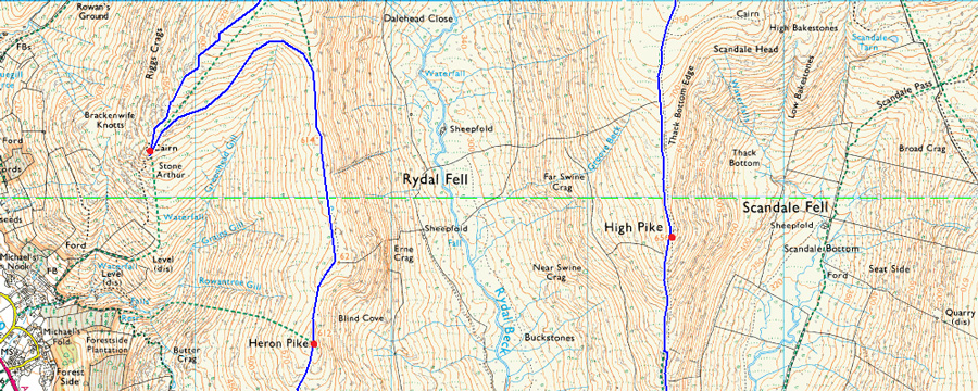 Pelter Bridge - A591 - Rydal Mount - Nab Scar - Heron Pike - Greenhead Gill - Stone Arthur - Great Rigg - Fairfield - Hart Crag - Dove Crag - High Pike - Low Pike - Low Sweden Coppice - Rydal Park - Rydal Mount - A591 - Pelter Bridge |