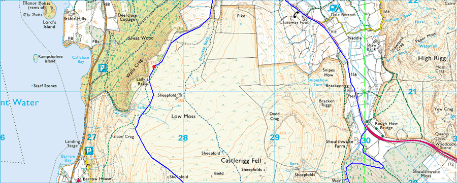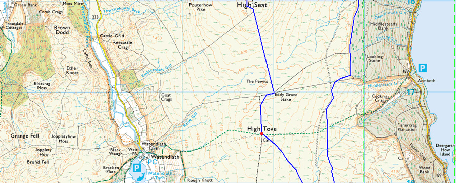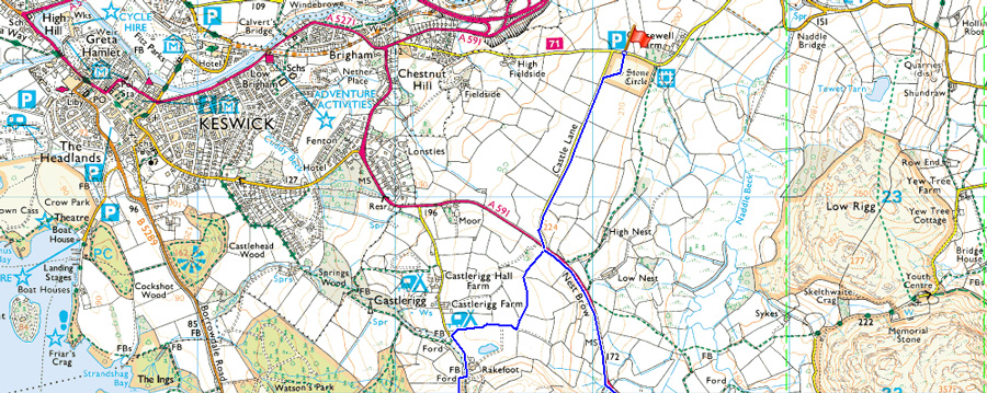 Castlerigg Stone Circle - Castle Lane - Rake Foot - Walla Crag - Bleaberry Fell - High Seat - The Pewits - High Tove - Armboth Fell - Forestry Track - Raven Crag - Forestry Track to Shoulthwaite Farm - A591 - Nest Brow - Castle Lane - Castlerigg Stone Circle |