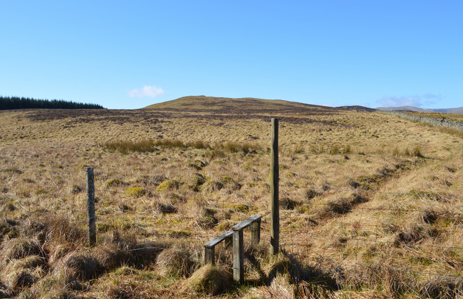 Crossing the next fence with views of Great Meldrum up ahead. |