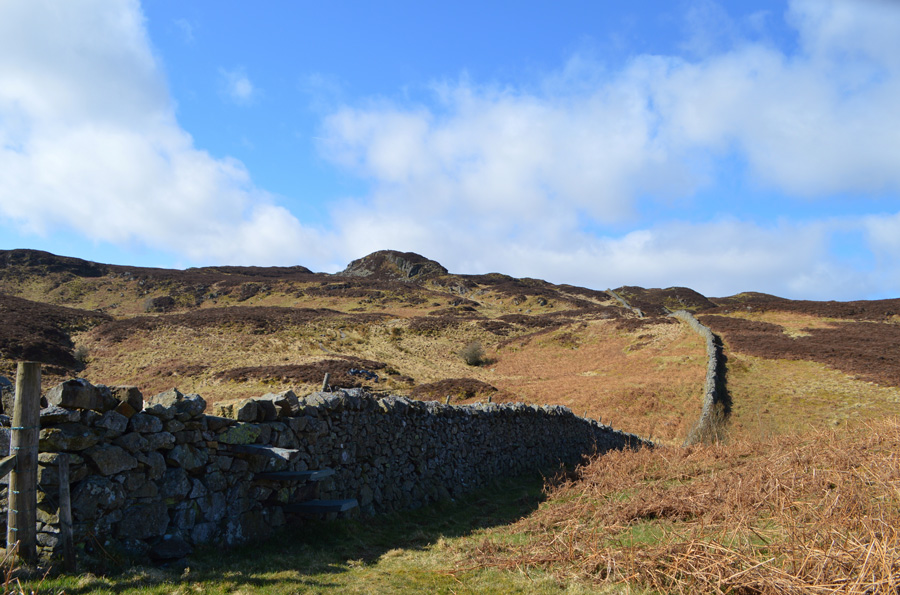 We cross the stone wall at Far Swan Beck which you can see were the stone wall dips in and out of the fell side by which time Swinside Knott was just above our heads. |