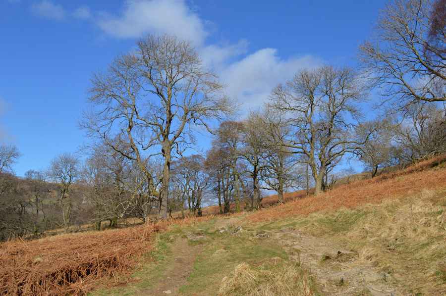 We ascend in single file with Rod up front, its a pretty steep climb and I guess after descending Gowbarrow followed by some lenient walking the steep ascent hit hard but we coped manageably even though we had to clamber over crag and below the fallen tree you see in the photo, it was one of those moments when you had to think 'now how do I get this square into that triangular hole' its only a tree but the way it had fell over the path we had to houdini our bodies and packs through the twisted branches and emerge a little higher up.
