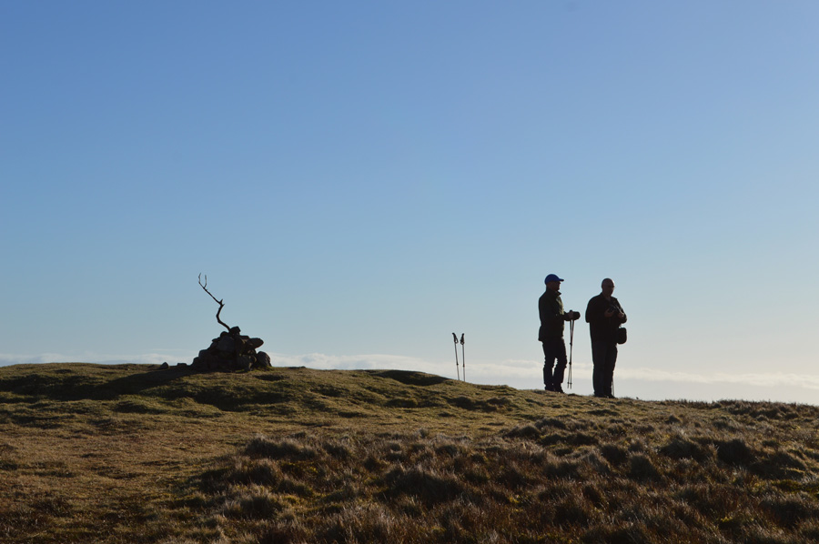 By 08:05am we had reached the summit of Great Mell Fell and were treated to a rather cool breeze but not cool enough for jackets. With the sun on our backs we each take our own summit photo most of which have our own shadows in them due to the sun being right behind us. I have a wander to the edge of the summit to take in the views over Souther Fell and Blencathra where I spent last weekend with Tim. There is a slight haze which is hampering views northwards but it looks like it will lift as the morning temperature rises.