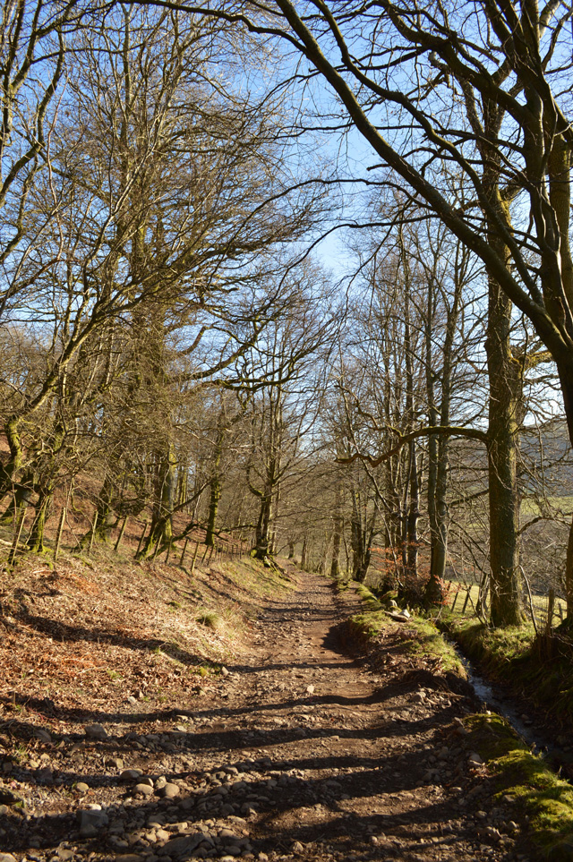 After crossing The Hause we pass through a metal gate and follow a farm track keeping close to the stone wall, after passing by the Fire Beaters we pass over a wire fence and start a slight descent flanking the woods by a boggy path as David points out to us that there's a little hidden gem of a Tarn in those woods.