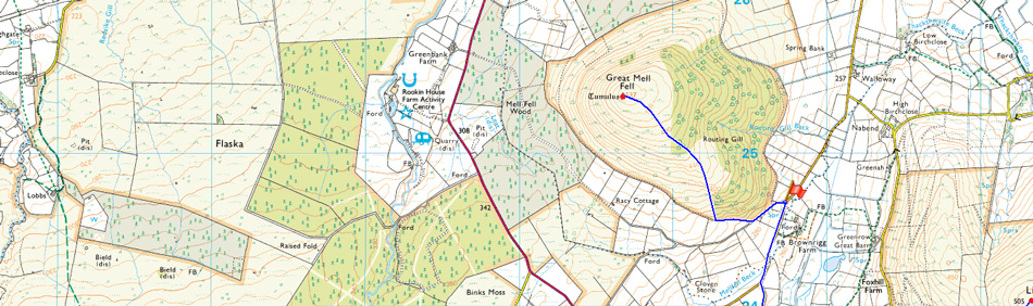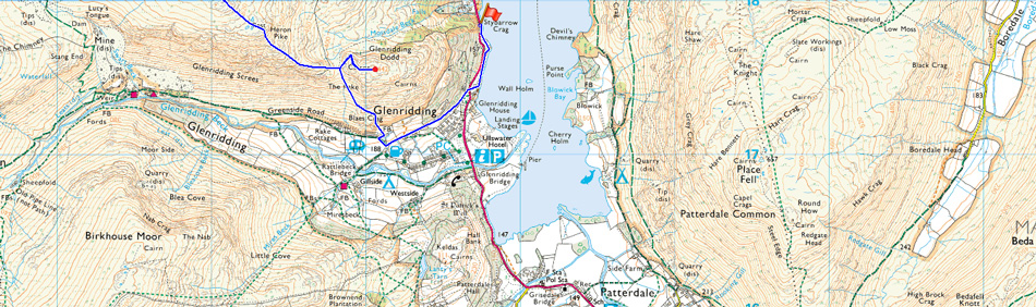 Brownrigg Farm - Great Mell Fell - Brownrigg Farm - Jenny Hill - The Hause - Little Mell Fell - The Hause - Great Meldrum - Gowbarrow Fell – Aira Beck – Park Brow - Watermillock Common – Birkett Fell – Hart Side – Glencoyne Head – Nick Head - Sheffield Pike – Heron Pike - Glenridding Dodd – The Rake - Greenside Road - Ullswater Shore Path - Stybarrow Crag