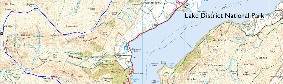 The principle height of this spur is Hart Side, which with its many satellites on the declining ridge forms the southern wall of the long valley of Deep Dale throughout its sinuous course, its opposite boundary being the short deep trench of Glencoyne. The upper slopes of this bulky mass are unattractive in themselves, but, in strong contrast, the steep flank over looking Ullswater is beautifully wooded, while the views of the lake from the Brown Hills, midway along the ridge are of high quality. |