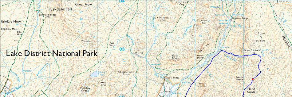 Cam Spout Crag, Sca Fell, Scafell Pike, Ill Crag, Esk Pike, Yeastyrigg Crags, High Gait Crags and Scar Lathing,Throstlehow Crag and finally Throstle Garth. |