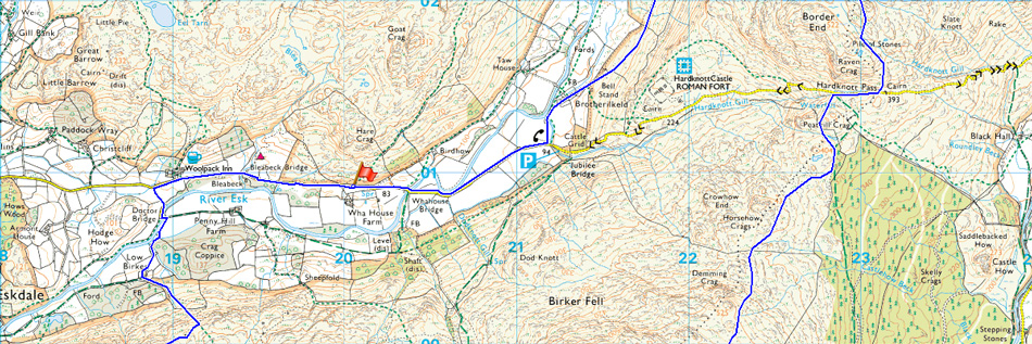 Wha House Farm Eskdale - Woolpack Inn - Docktor Bridge - Low Birker - Low Birker Tarn - Green Crag - Long Crag - Harter Fell (Eskdale) - Hardknott Pass - Hard Knott - Great Gill - River Esk - Brotherilkeld - Wha House Farm Eskdale |