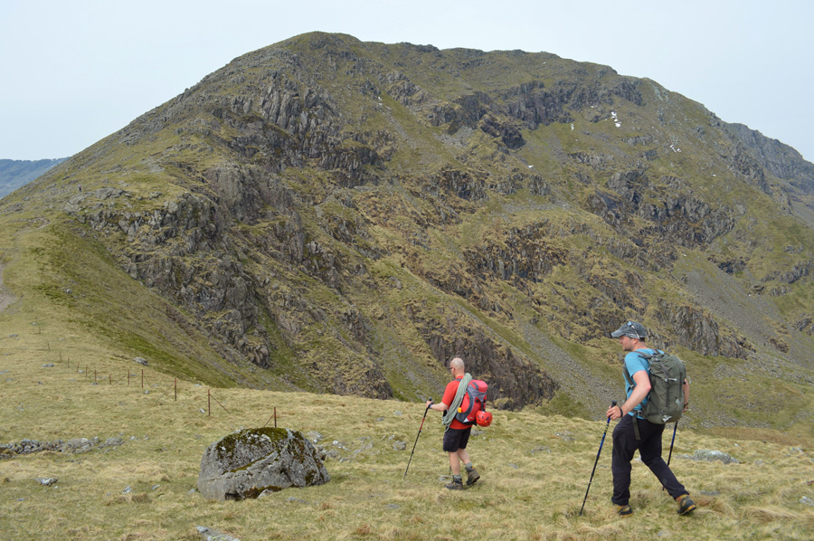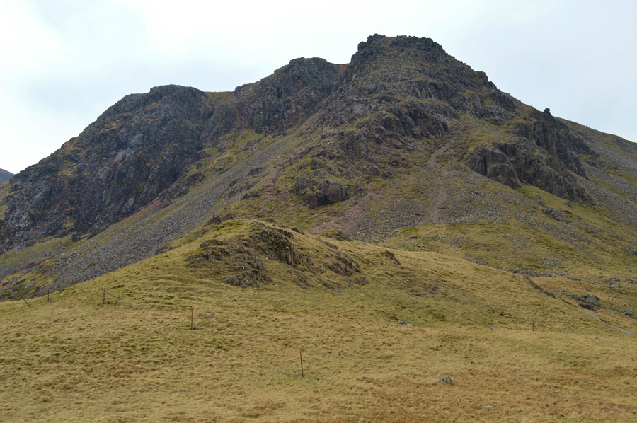 Today we are following the original route set by Bill Birkett which ascends towards the top of the Black Sail Pass via Gatherstone Beck which is out of view but over on the right beyond the flanks of Kirk Fell. From the top of the Black Sail Pass we will head north west collecting the summit of Looking Stead before continuing over the top of Green Cove until the stone cairn is reached marking the spot for the start of the High Level Route towards Robinsons Cairn, from where we will get our first real view of Pillar Rock.