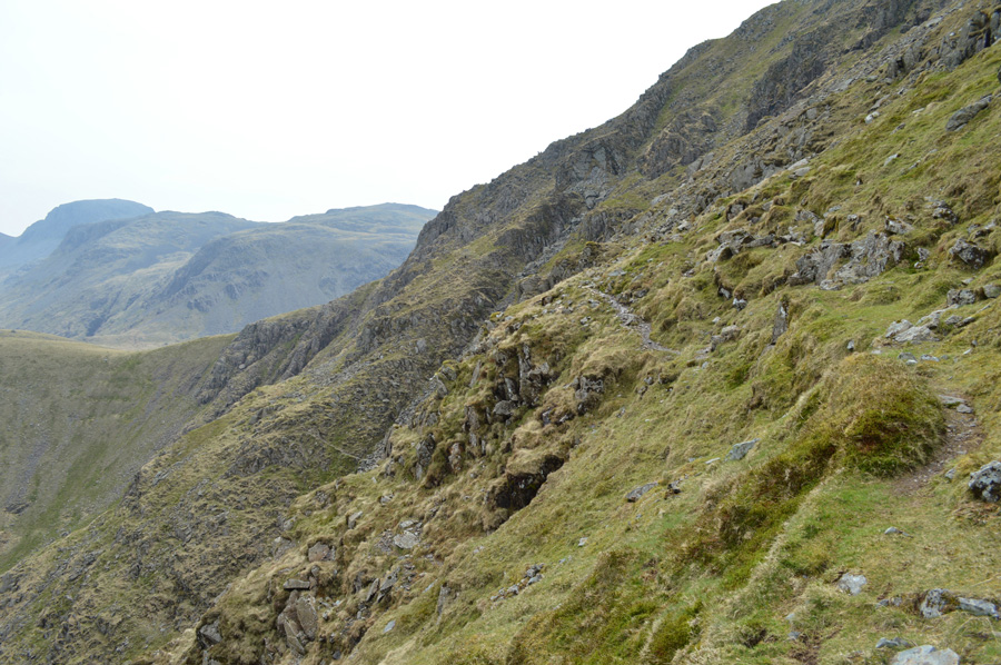 We are now on the High Level Route which spans the horizontally across the broad flank of Pillar, despite the path being quite narrow in places and with the odd little scrabble thrown in there is no real feeling of exposure as you may expect, down below another fainter path also traverses across the mountain side but if my memory serves me right the lower path is 'rougher' than the higher of the two paths, this I can claim because I've now used them both. We strike out towards Robinsons Cairn which for now, is still out of view. |